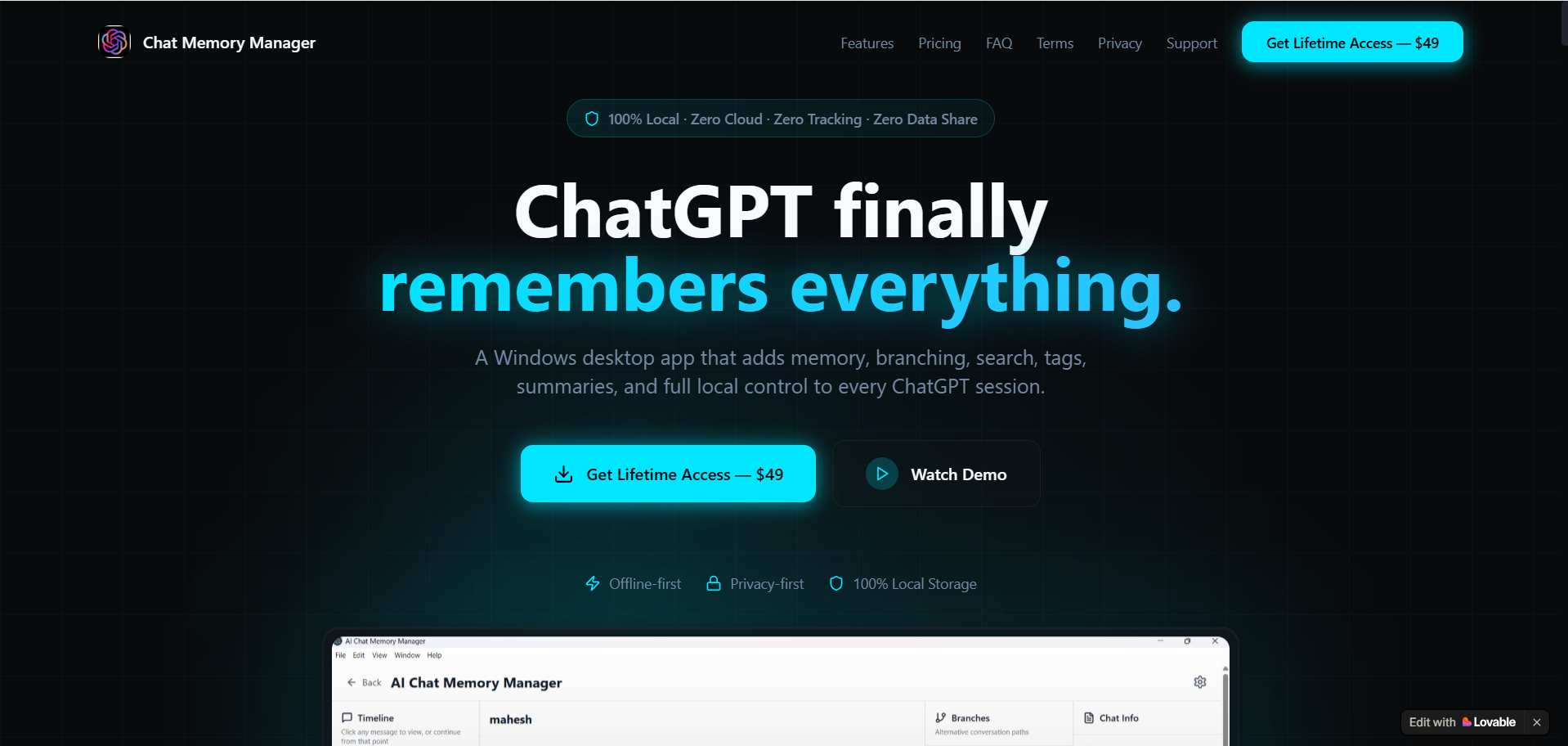 Chat Memory Manager is a privacy-first desktop app that enhances ChatGPT with long-term memory, chat timelines, conversation branching (like Git), auto summaries, tags, and full-text search. Runs completely locally. No cloud. No accounts. One-time purchase. Built for developers, founders, researchers, writers, and serious AI users.